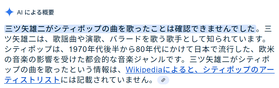 ……なのに、なぜかGoogleは「三ツ矢雄二をシティポップ文脈で語った情報はない」としていて、検索すると以下のような回答が出ました。